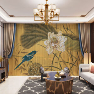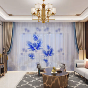 3D Chinese Style Blue Bird and White Flower Printed Decorative 2 Panels Custom Sheer