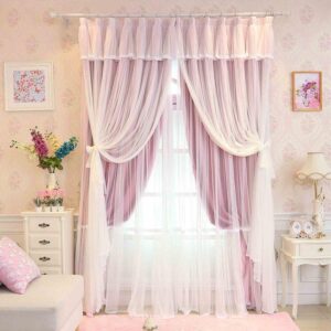 Princess Style Window Curtains Pink Sheer and Cloth Sewing Together Blackout Custom Curtain