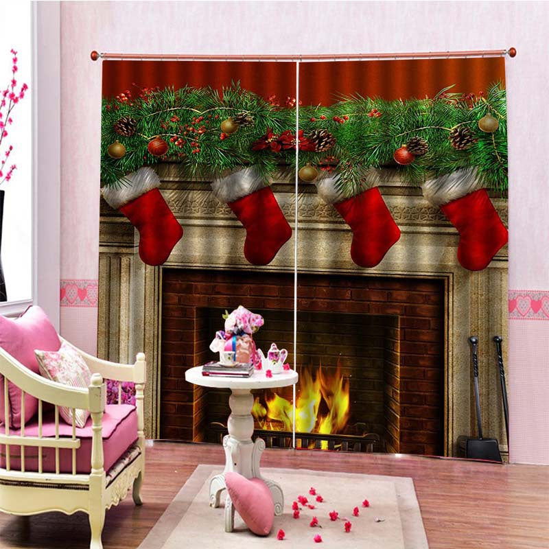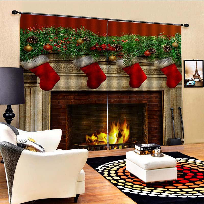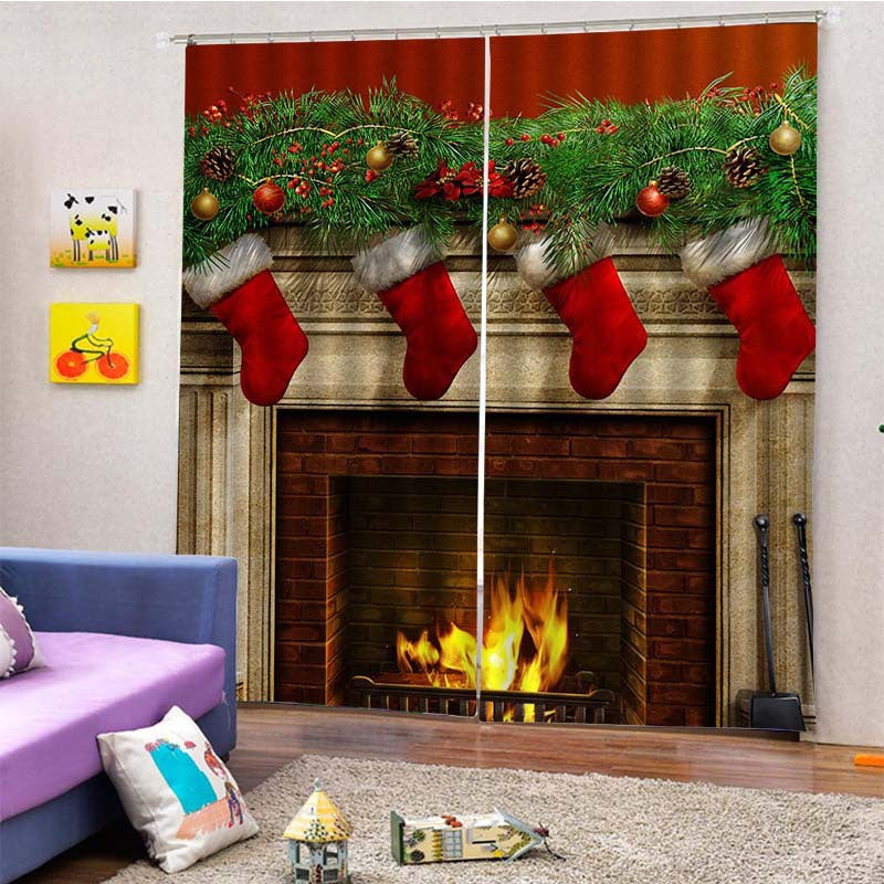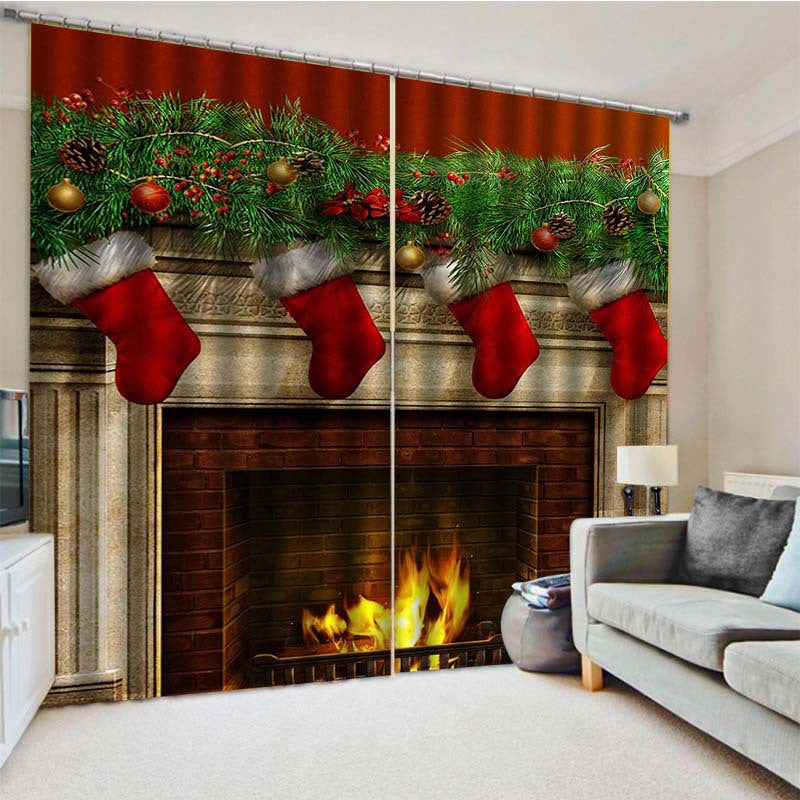 3D Christmas Stockings and Fireplace Print Blackout Decorative Curtains for Living Room Bedroom