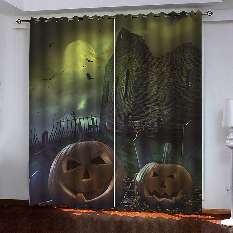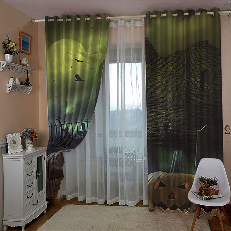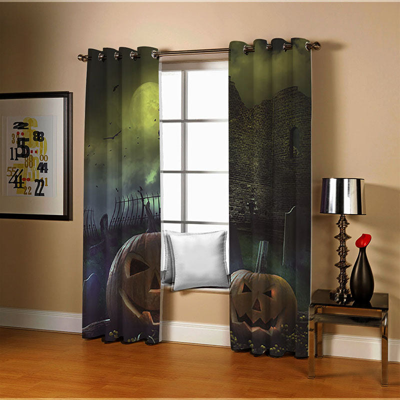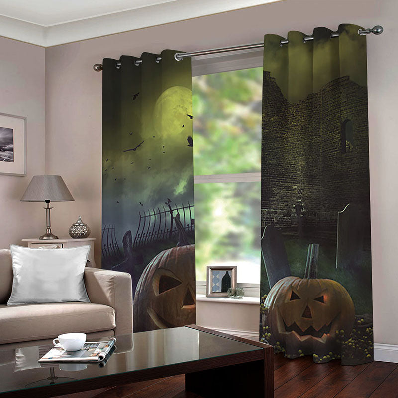 3D Green Halloween Night Pumpkin Printed Blackout Decoration Window Curtains for Living Room and Bedroom Custom 2 Panels Drapes No Pilling No Fading No off-lining