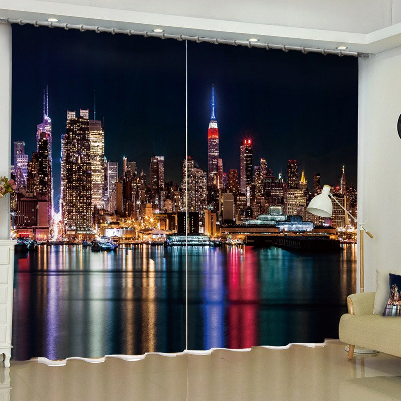 3D Modern Buildings Printed Wonderful Night Scenery 2 Panels Custom Living Room Curtain