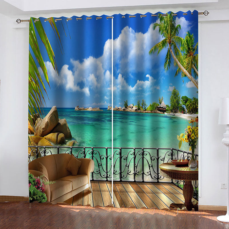 3D Printed Ocean Beach Tropical Palms Holiday Paradise Coast Charm Blackout Decorative Curtains Custom 2 Panels Drapes No Pilling No Fading No off-lining