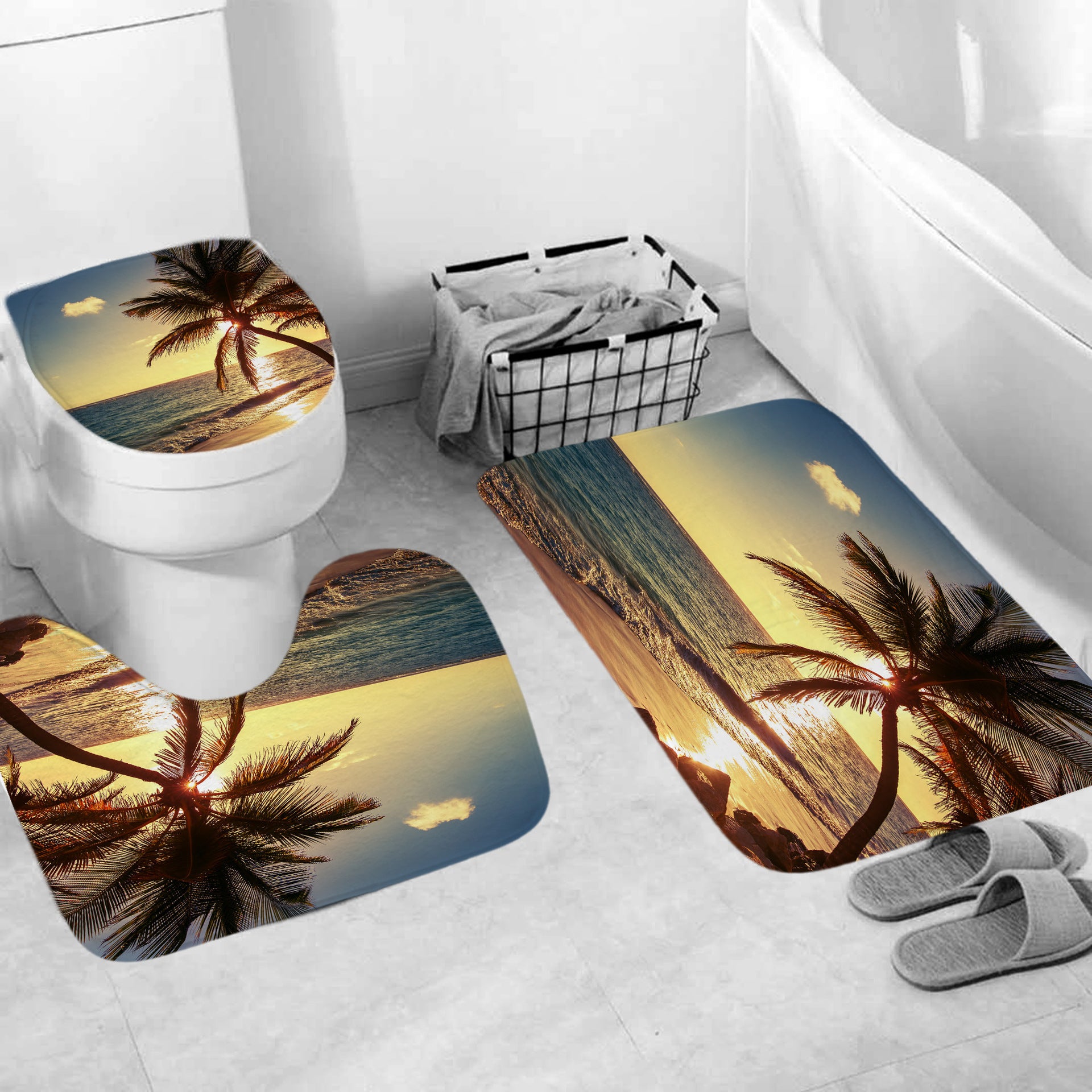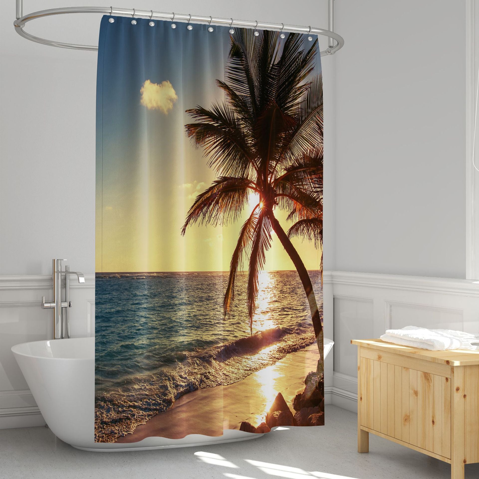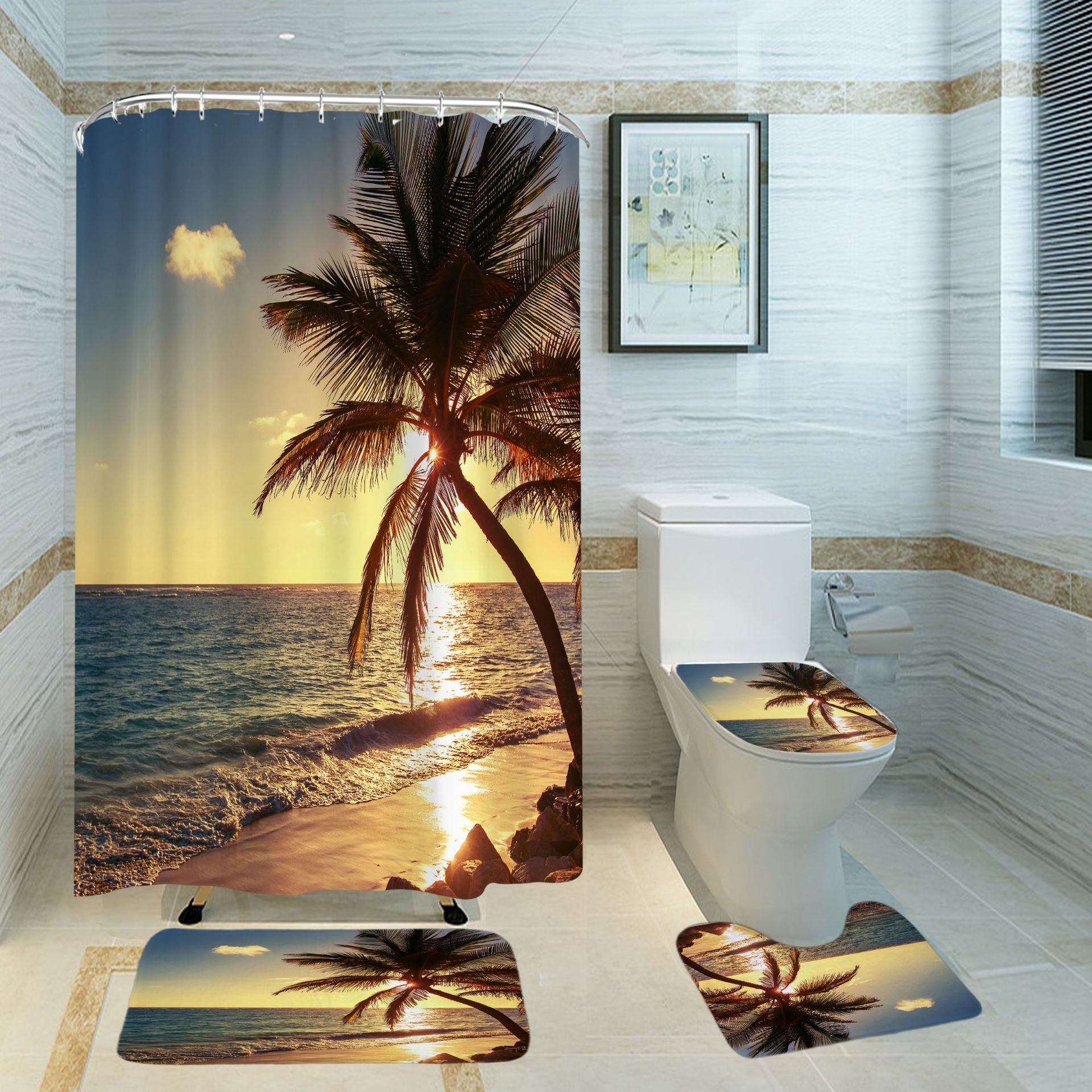 3D Shower Curtain Beach Sunset and Palm Trees Bathroom Partition Curtain Set Durable Waterproof Mildew Proof Polyester