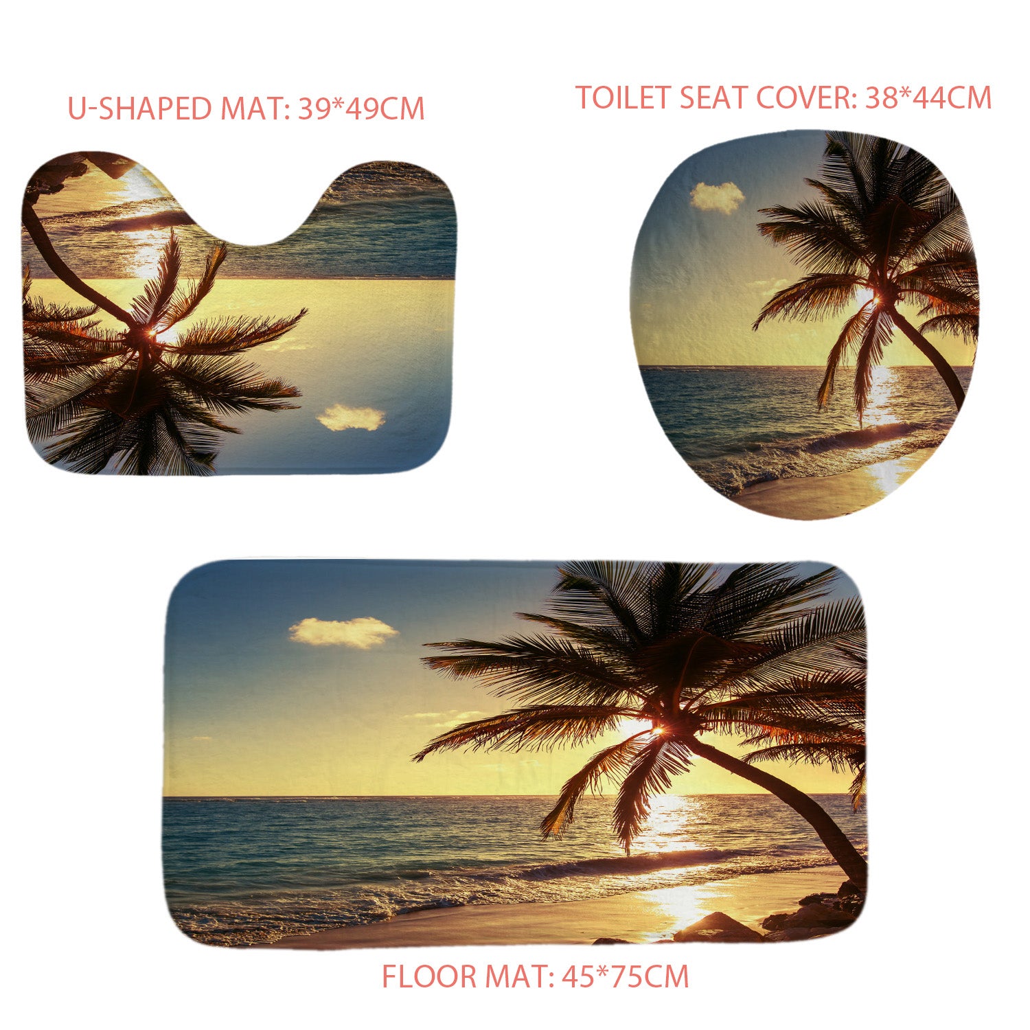 3PCS Size: Floor mat 45*75cm, U-shaped mat 49*39cm, Toilet seat cover 38*44cm