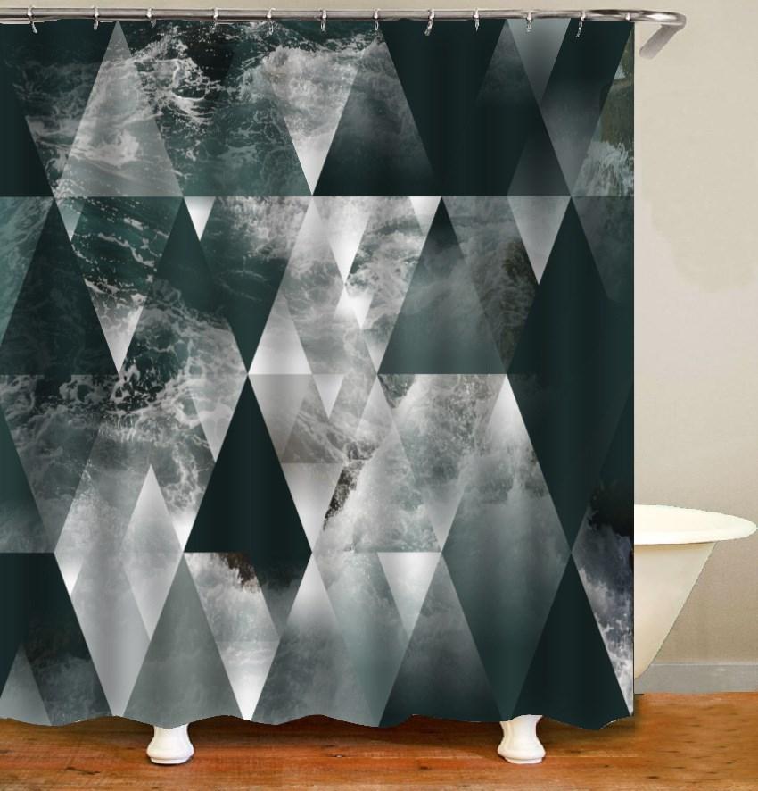 3D Shower Curtain Gray Black Triangle and Waves Pattern Bathroom Partition Curtain Set Durable Waterproof Mildew Proof Polyester
