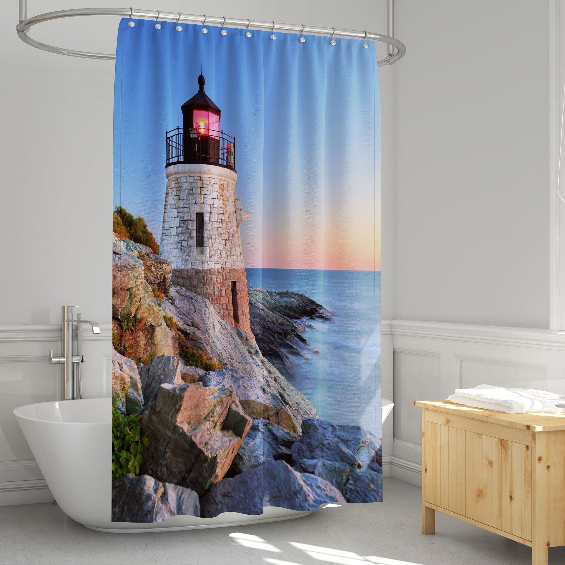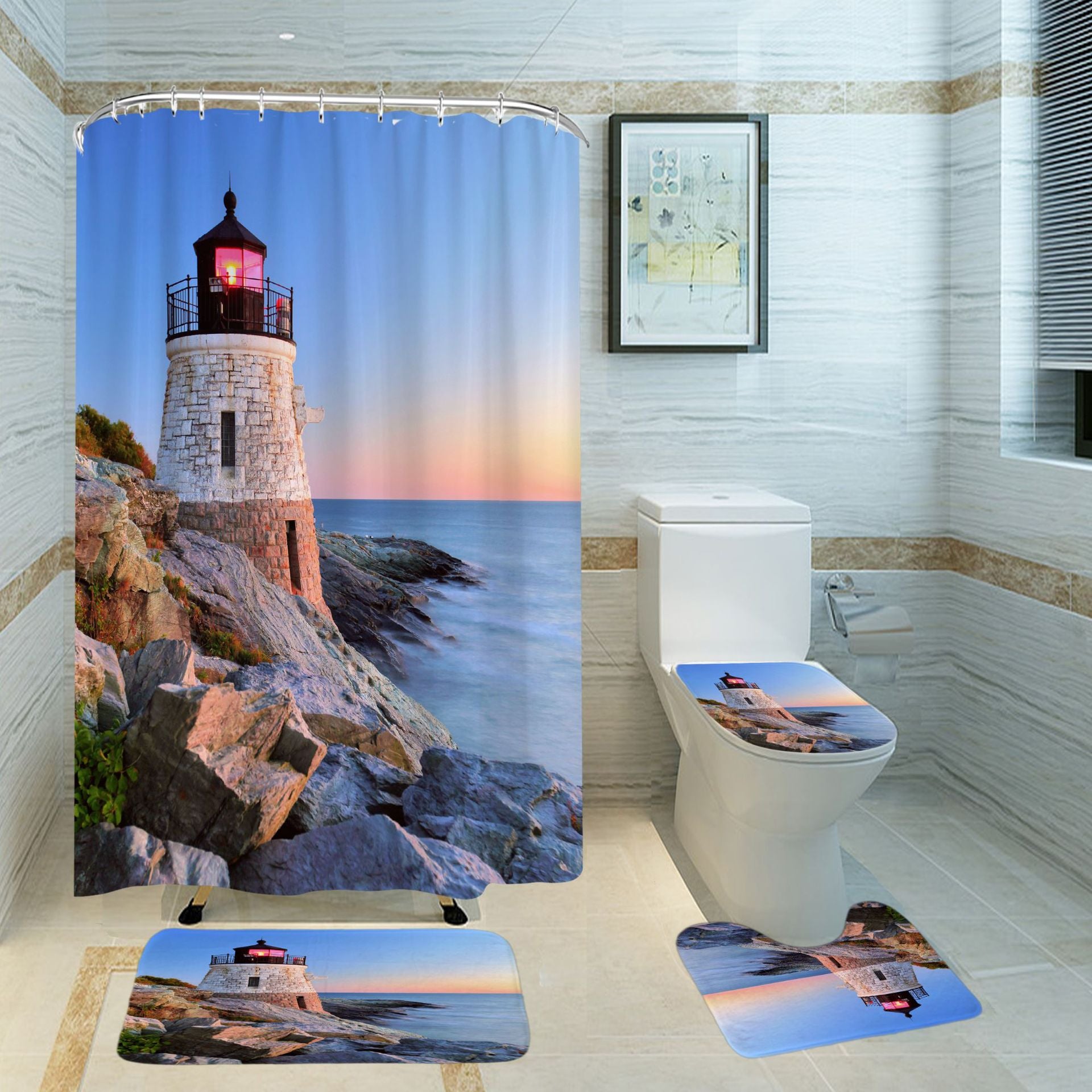 3D Shower Curtain Lighthouse Pattern Bathroom Partition Curtain Set Durable Waterproof Mildew Proof Polyester