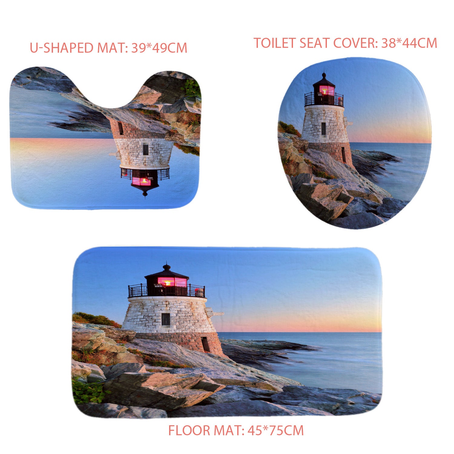 3PCS Size: Floor mat 45*75cm, U-shaped mat 49*39cm, Toilet seat cover 38*44cm