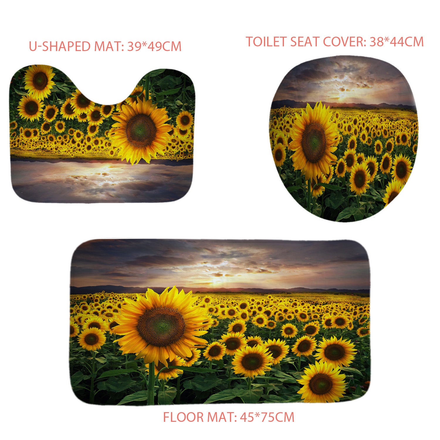 3PCS Size: Floor mat 45*75cm, U-shaped mat 49*39cm, Toilet seat cover 38*44cm