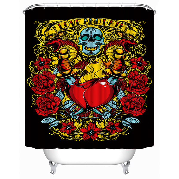 3D Skull and Heart Printed Polyester Black Shower Curtain