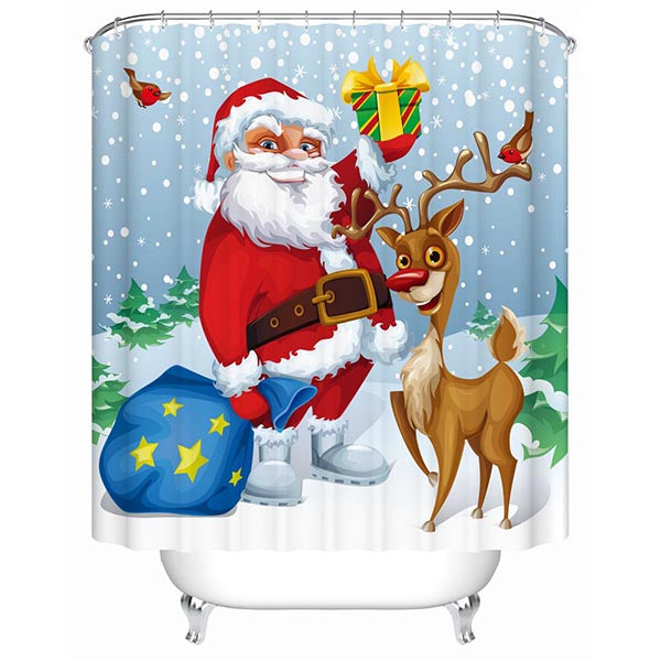 Adorable Sweet Santa and Cute Deer Printing 3D Christmas Theme Shower Curtain