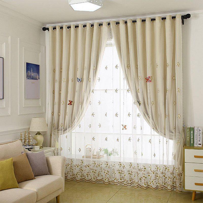 Embroidery Blackout and Decorative Cloth and Sheer Sewing Together Beige 2 Panels Curtain