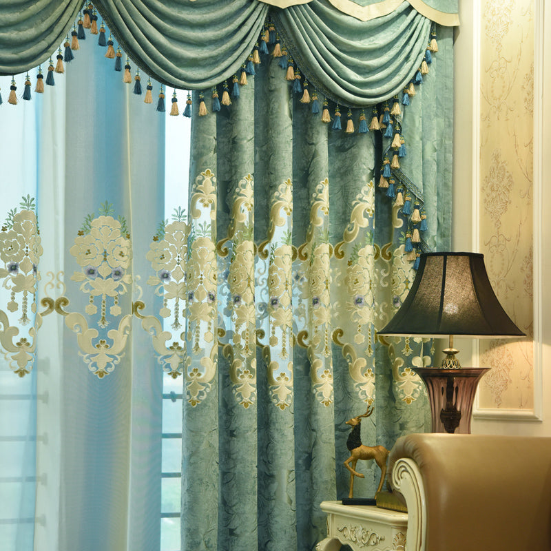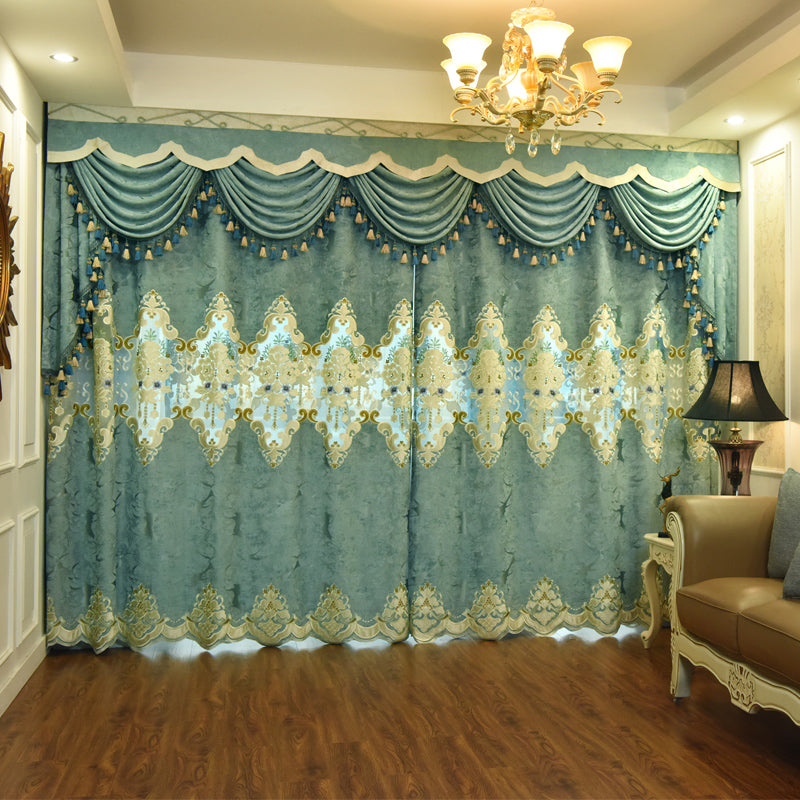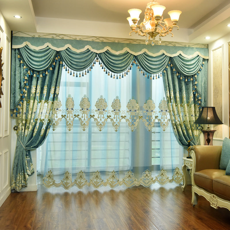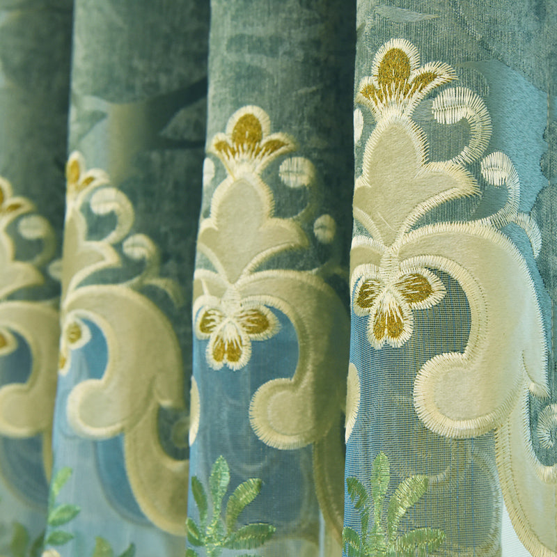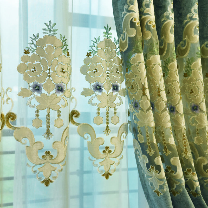 European Blue Blackout Curtains Thermal Insulated Sun Light Blocking for Bedroom Living Room Embroidery Window Curtains 2 Panels Drapes