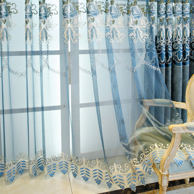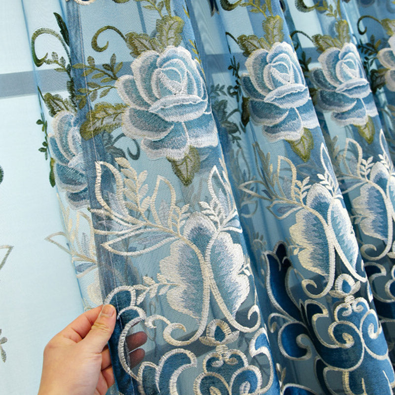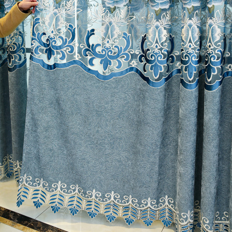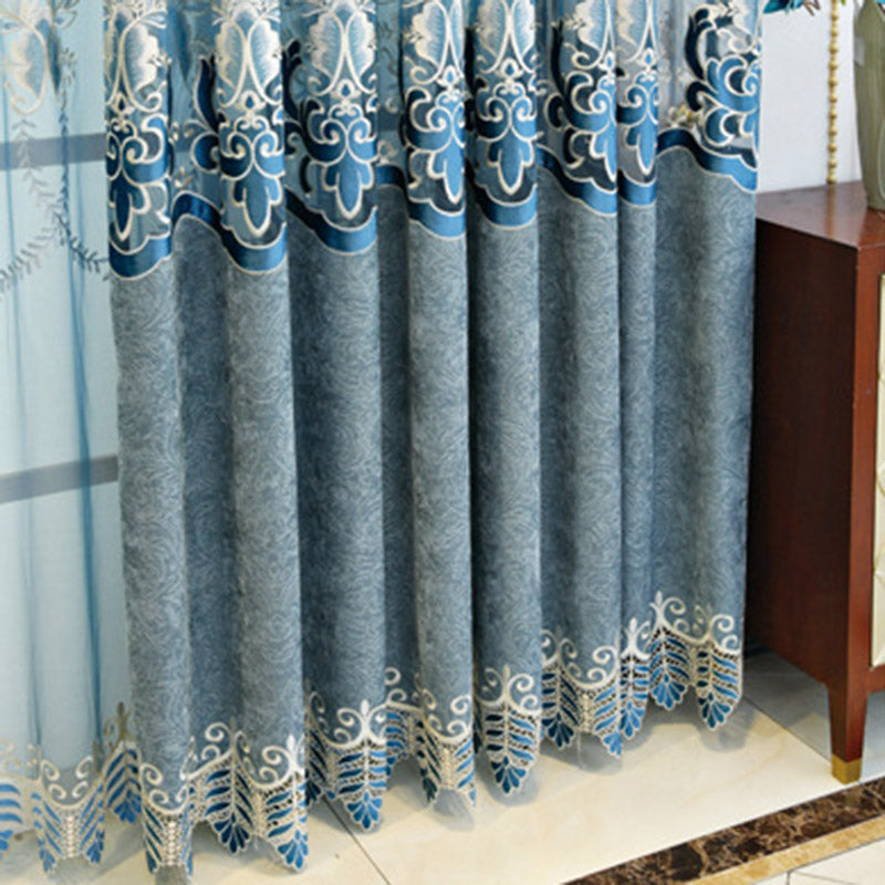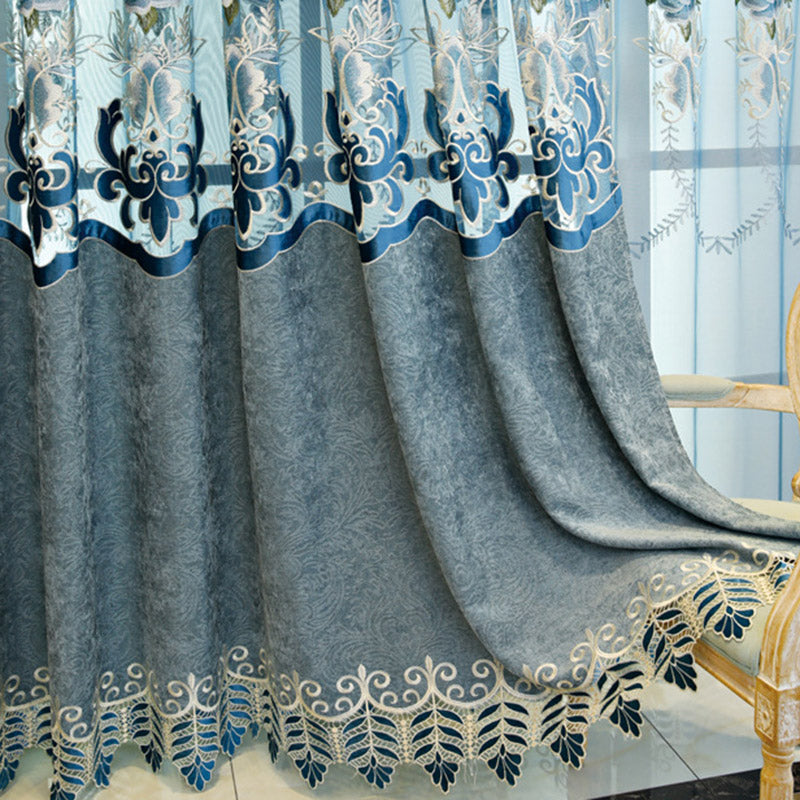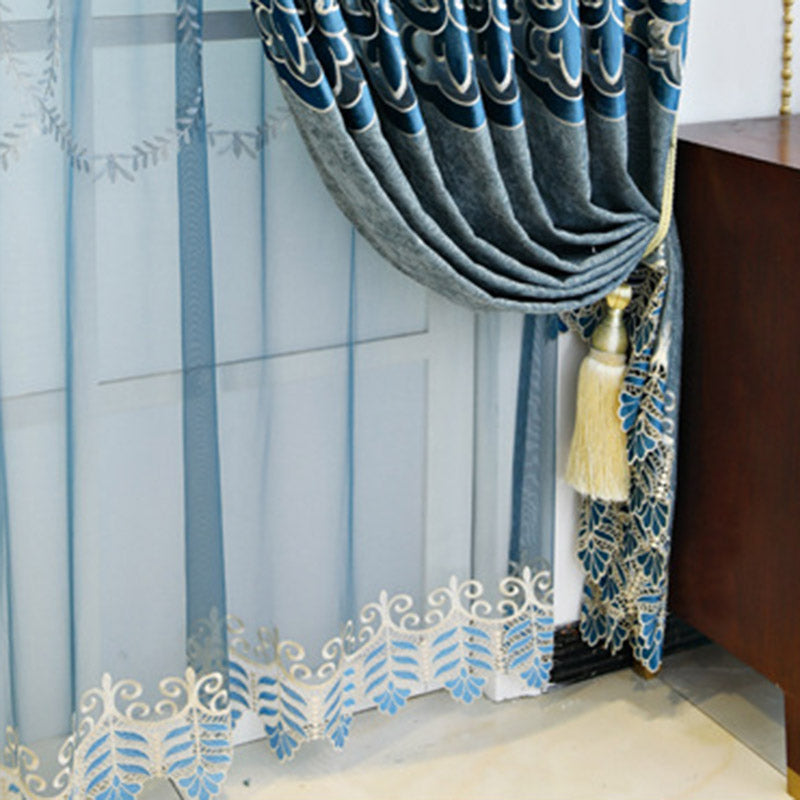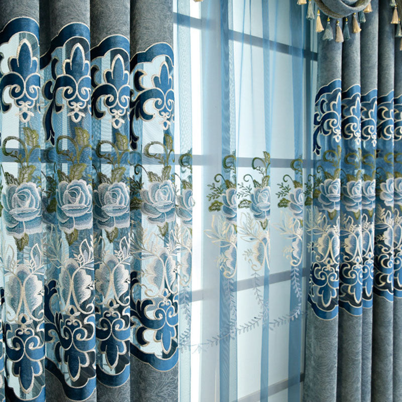 European Vintage Blackout Curtains High Quality Elegant Blue Chenille Embroidery Window Curtains Sheer for Living Room Bedroom 2 Panels Drapes