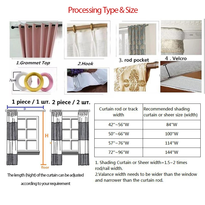 Including: 2 panels x shading curtain or 1 panels x valance (sold seperately)Material:ChenilleUsage: Living Room and BedroomStyle:ModernDecorationColor: The Same as PictureShading Degree: Shading Cloth 60-80%Processing Type: Shading Curtains-Grommet Top, Valance-Rod Pocket