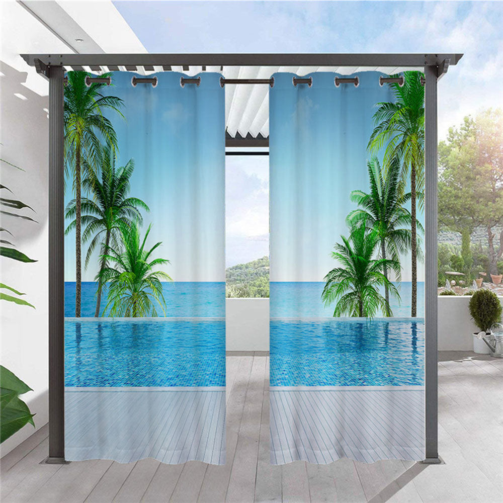 Modern Blue Outdoor Curtains Coconut Tree 3D Sea Scenery Cabana Grommet Top Curtain Waterproof Sun-proof Heat-insulating 2 Panels