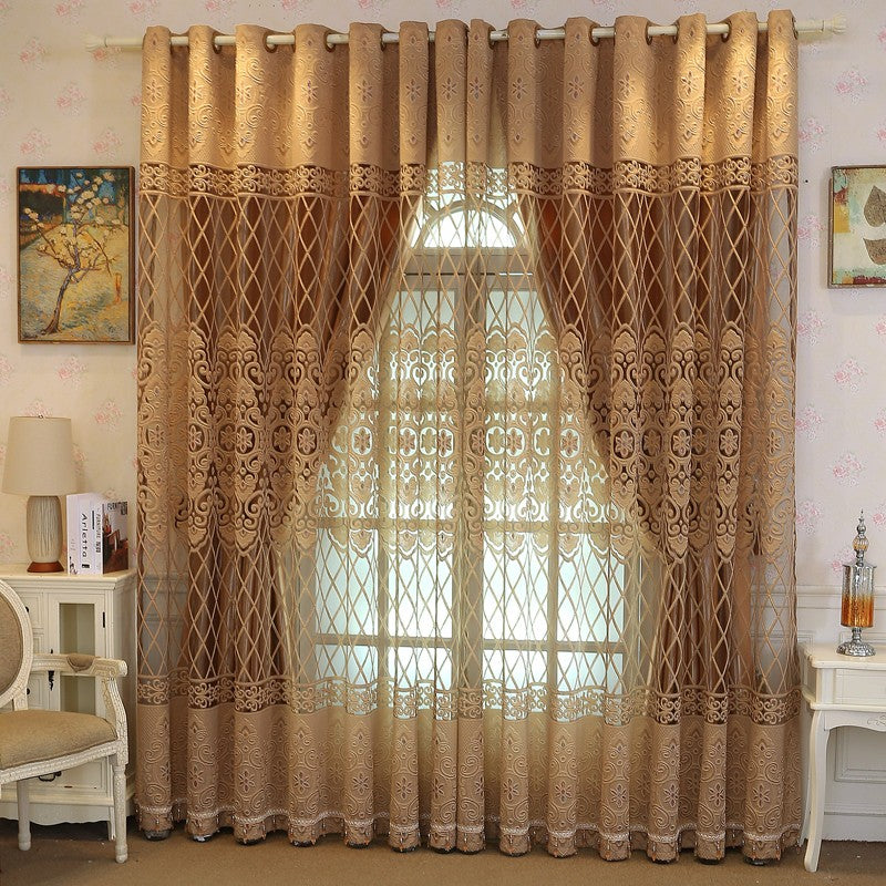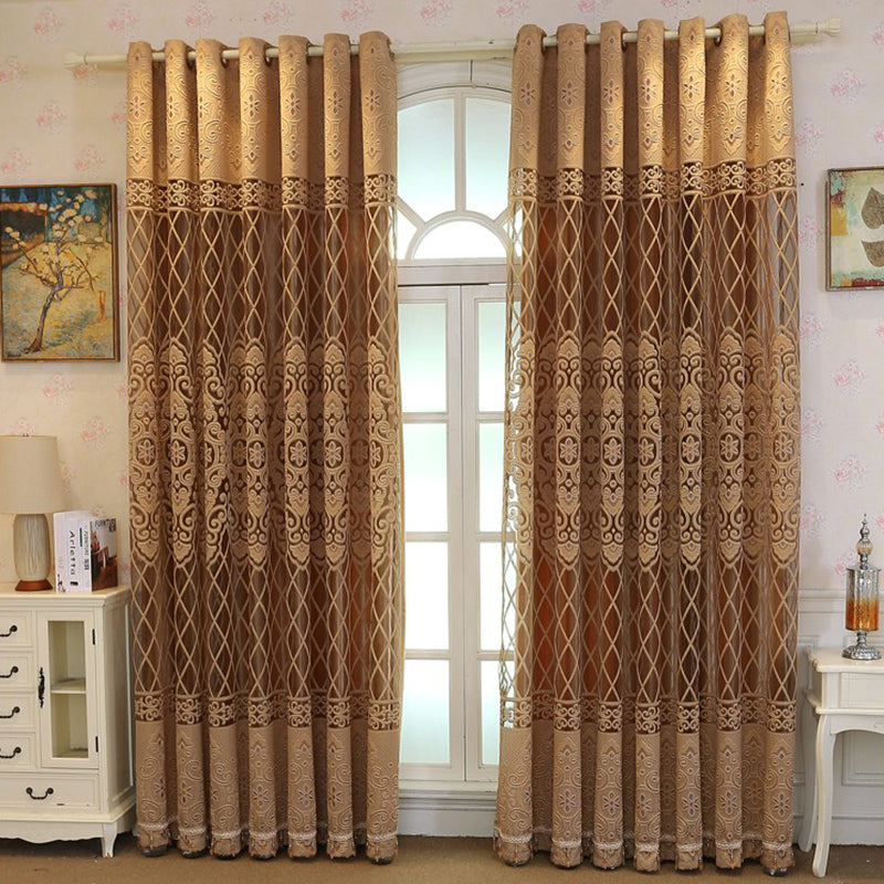 New European Elegant Floral Embroidery Gold Brown Double Shading Curtains Luxurious Hollow Curtains for Living Room Bedroom Decoration Custom 2 Panels Drapes Polyester Blend