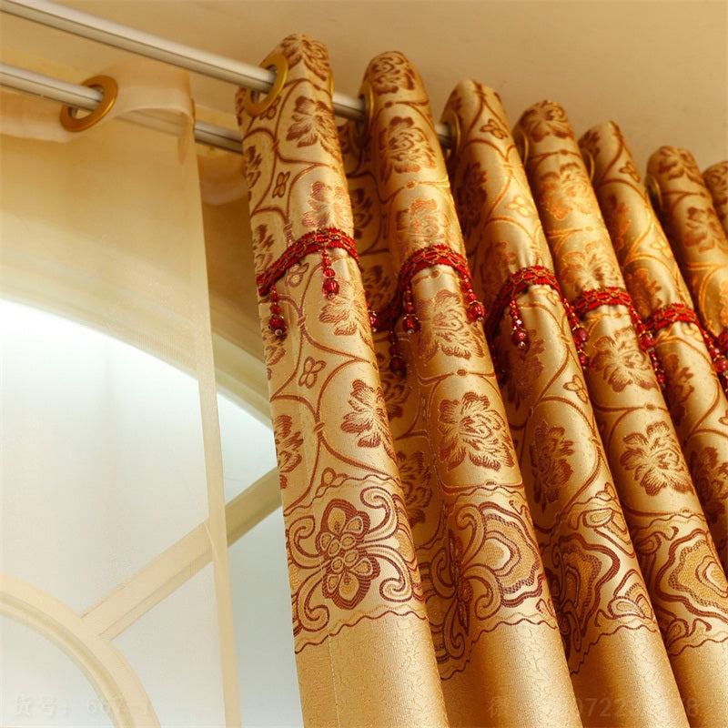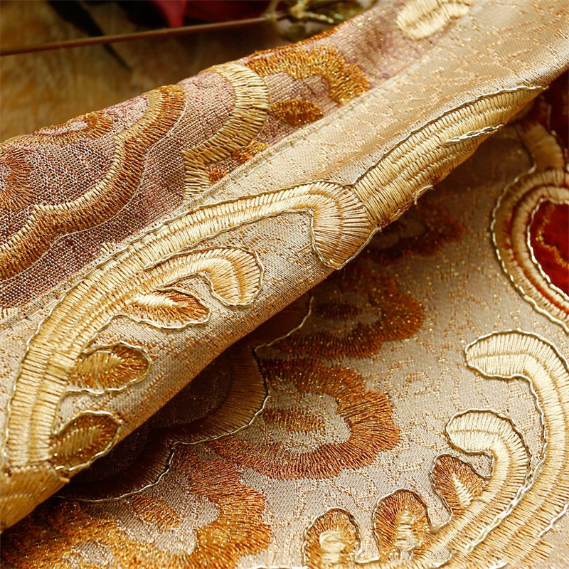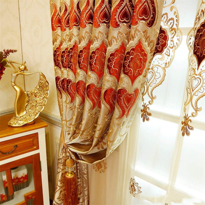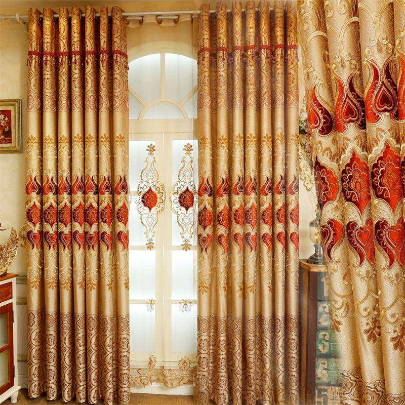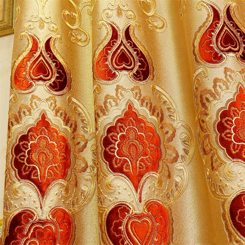 Noble and Elegant Blackout Curtains Thick Chenille Embroidered Golden and Red Flowers Shading Curtain 2 panels Grommet Top Curtain